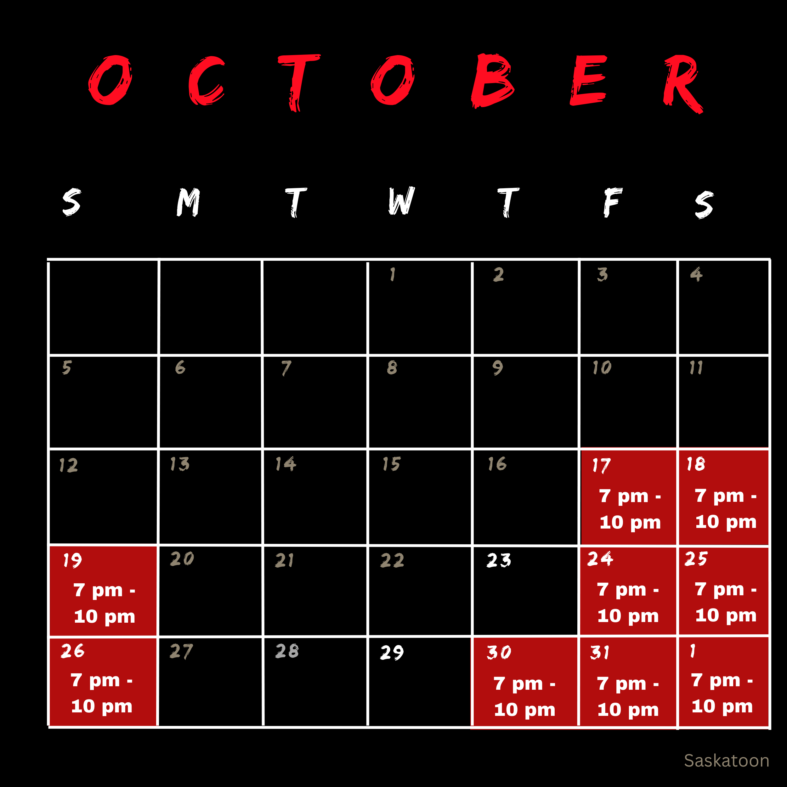 Coming this October!! A TERRIFYING EXPERIENCE Upcoming Events Saskatoon, Saskatchewan Saskatoon Details Explore The Terrifying Come for the fun, leave with the nightmares! General Information Where to find us Saskatoon, SK Saskatoon Details